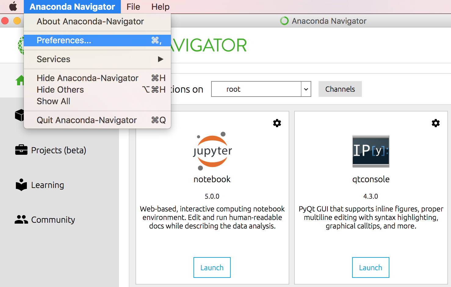 在顶部菜单栏的Anaconda Navigator菜单(在 macOS 上是File)中,选择 Preferences。